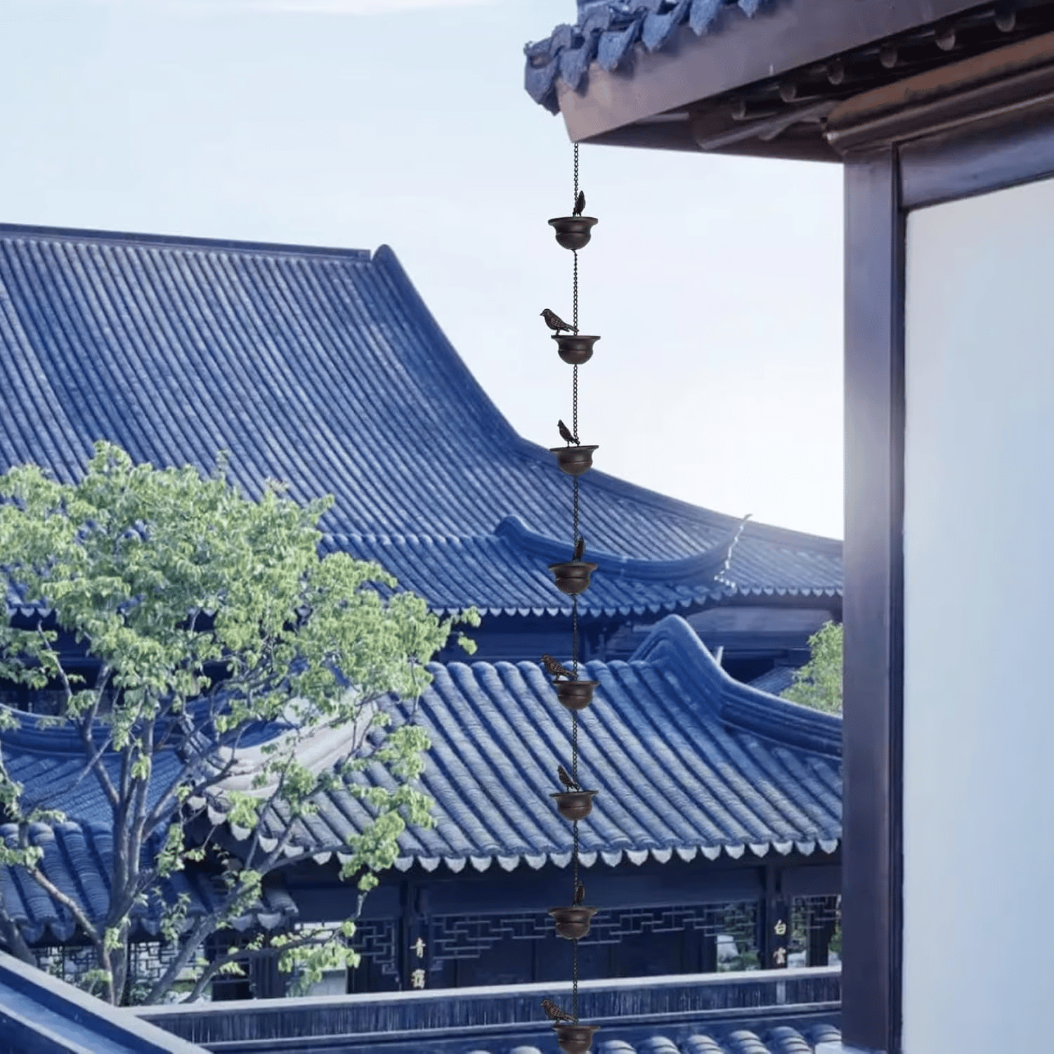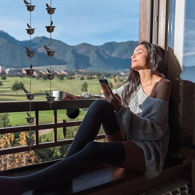 Transform gutters, patios, or pergolas into tranquil oases with this decorative rain chain, featuring eight beautifully crafted birdbath cups. Whether it’s raining or sunny, it adds natural elegance, calming sound, and visual interest to your outdoor space.