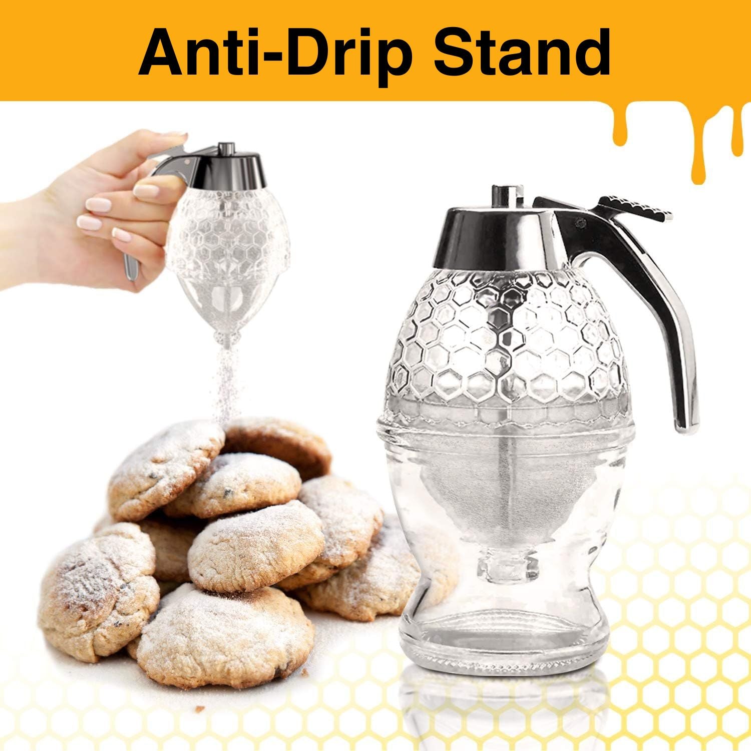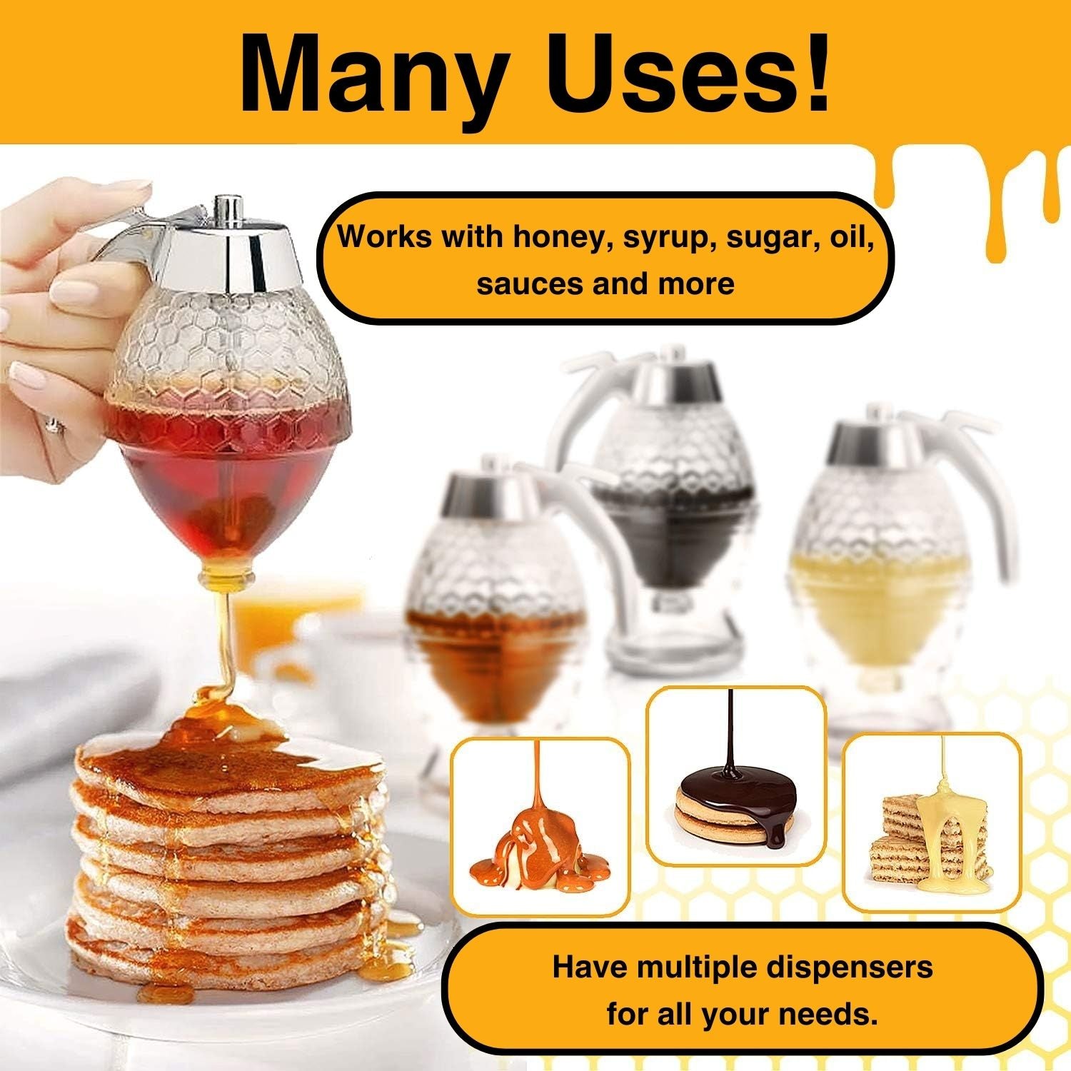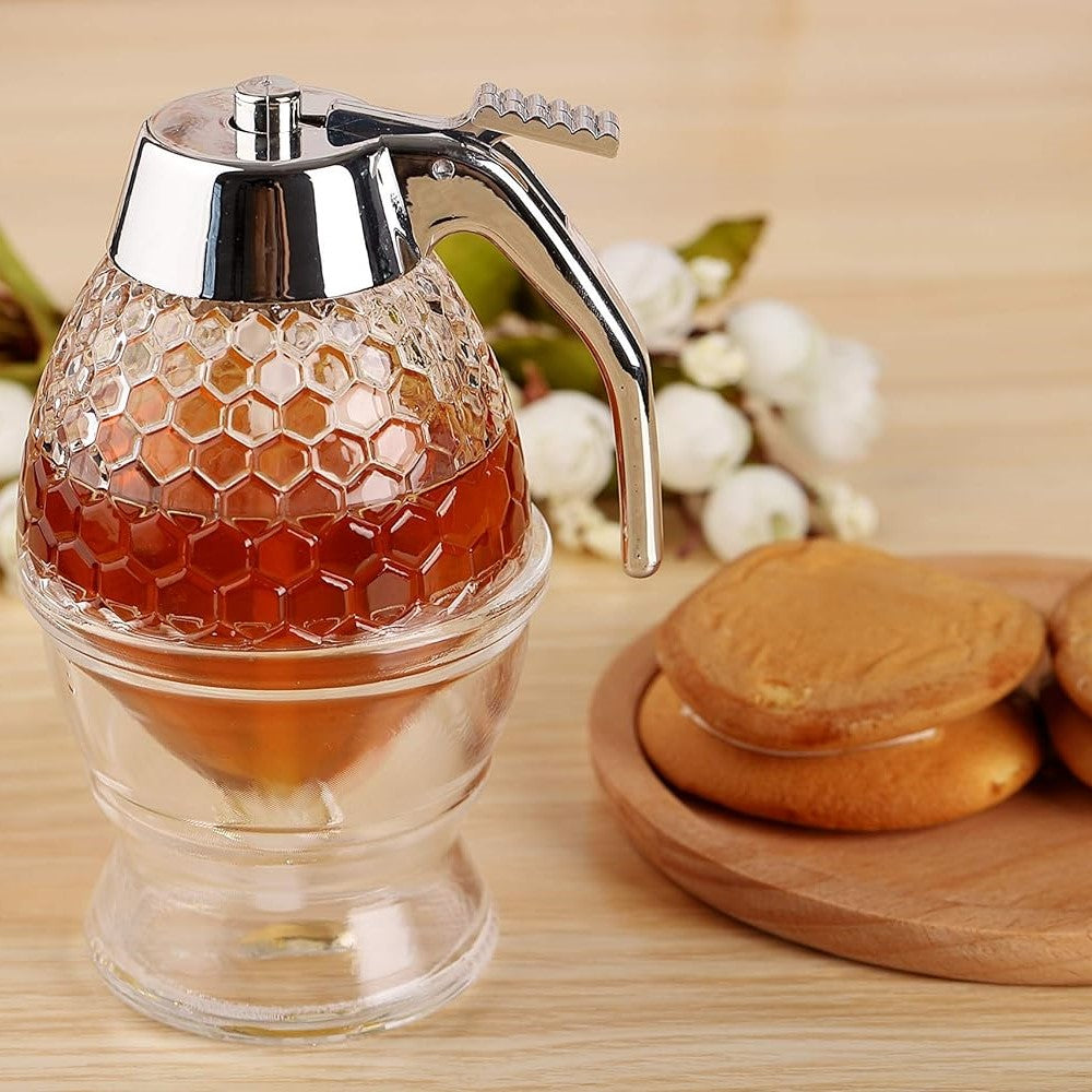 An innovative dispensing tool for sticky syrups like honey & much more! It is designed for sweet perfection, offering a generous 8 ounces of delicious capacity! With its convenient & durable design, the base holds the dispenser and contains any sticky, drippy mess, ensuring your kitchen/dining area stays clean and does not attract unwanted critters!