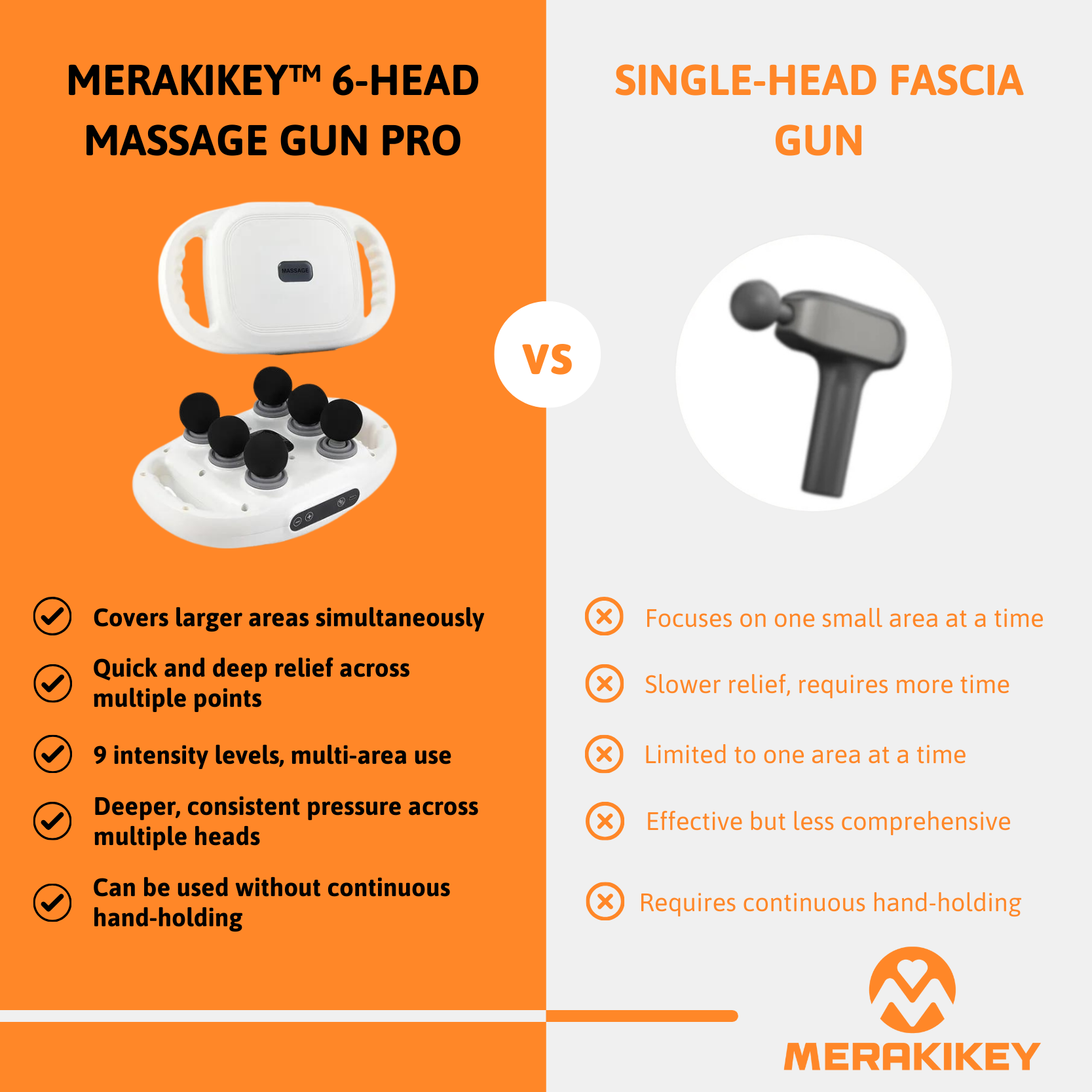 Worn out after intense workouts? Whether you're an athlete or someone who deals with muscle pain, incomplete recovery can severely hamper your daily life. The MERAKIKEY™ 6-Head Massager delivers targeted relief, providing consistent and effective muscle repair across multiple areas, eliminating the frustration of inconsistent performance.