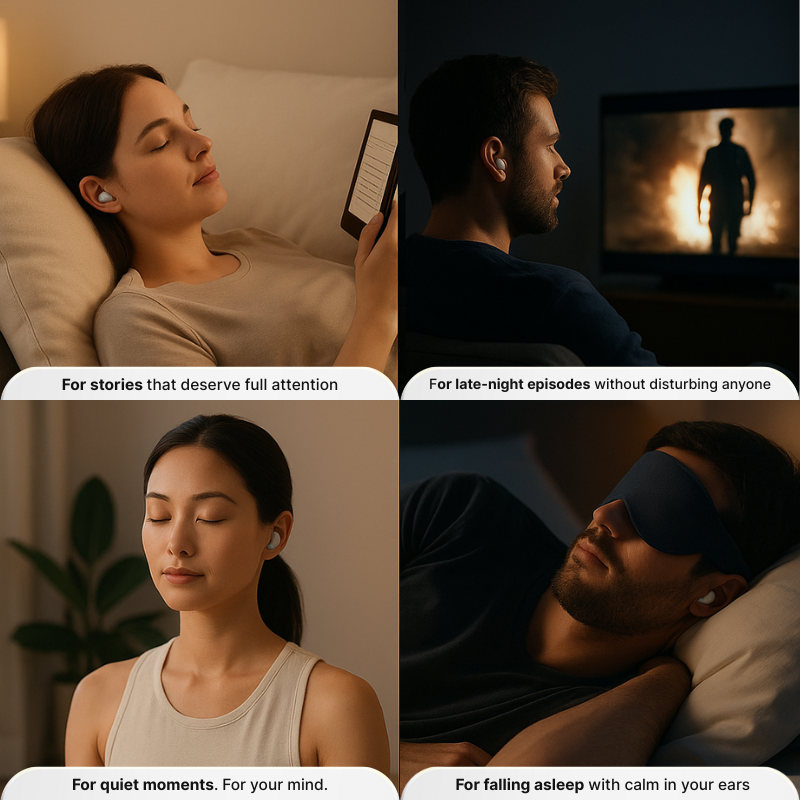 Regular earbuds cause pain, fall out when you move, and keep you awake with blinking lights or bulky designs. Whether you’re trying to relax at home, sleep next to your partner, or enjoy music on the go, discomfort ruins the moment.
